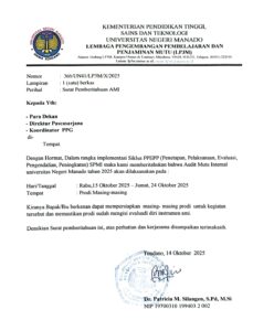 Kepada Mahasiswa (S3, S2, S1, D3, maupun profesi) Universitas Negeri Manado untuk dapat mengisi Form Kepuasan Layanan Mahasiswa UNIMA sebagai salah satu instrumen untuk mengevaluasi kepuasan layanan mahasiswa.Terima kasih atas perhatian dan respon dari Bapak/Ibu/Sdr/i mahasiswa sekalian.
